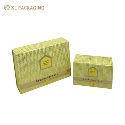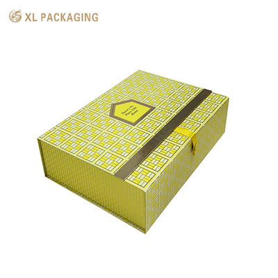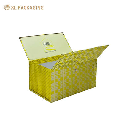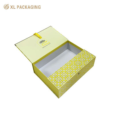 A caixa de presente de papel feita de papelão robusto de 2 mm e papel revestido de 157 gramas, esta caixa de presente não é só durável, mas também visualmente impressionante,com um desenho amarelo brilhante criado com impressão Pantone de alta qualidadePara garantir a longevidade, a caixa de papel é revestida com um acabamento fosco que protege contra o desgaste, mantendo um visual sofisticado.A adição de padrões de estampagem em folha e um logotipo em folha de ouro preto eleva ainda mais o apelo da embalagem da caixa de presentes, criando um equilíbrio harmonioso entre simplicidade e design complexo.