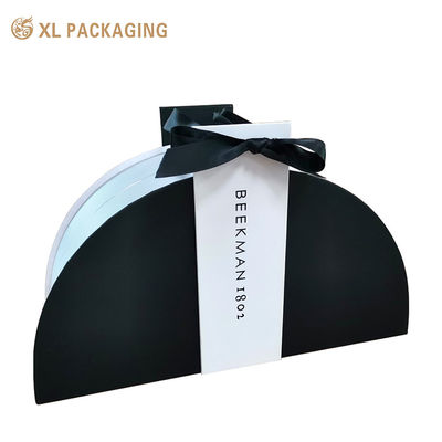 Nossa caixa de presentes semicircular apresenta um design luxuoso no clássico esquema de cores preto, branco e prateado, elevando qualquer ocasião de presente com sua estética sofisticada.